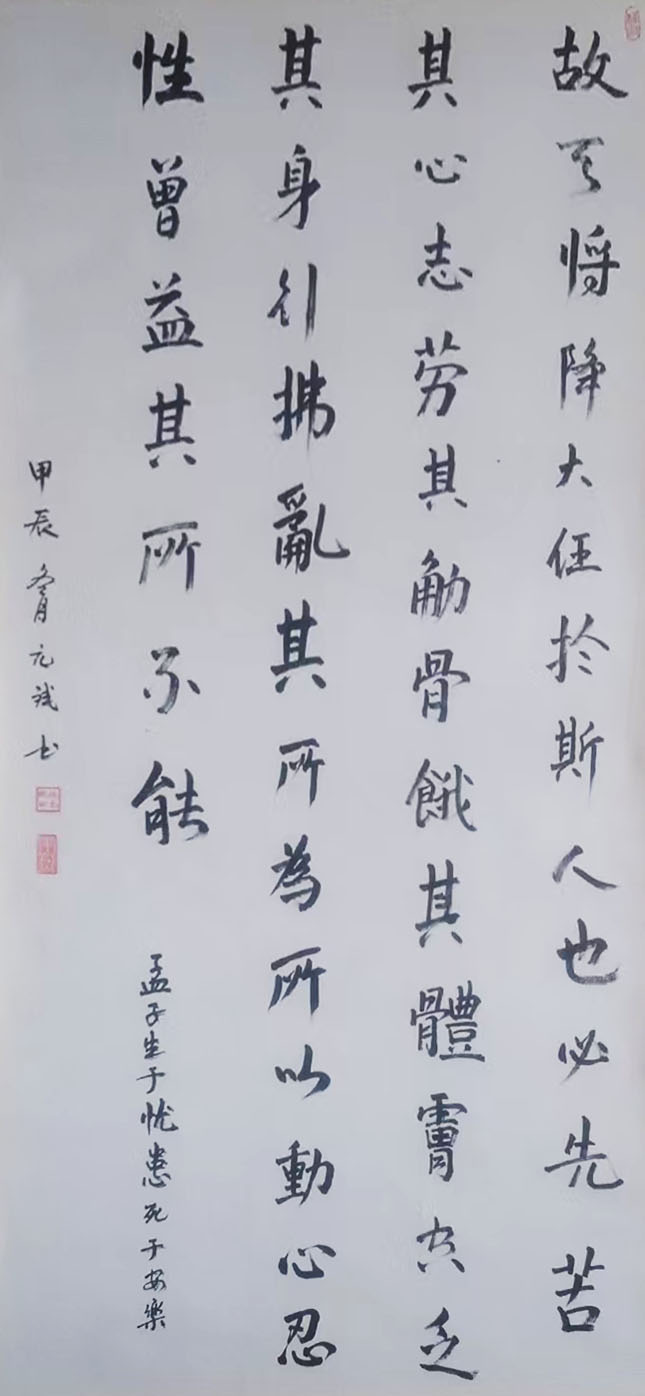 每次創(chuàng)作都是心靈的對(duì)話(huà)。當(dāng)他拿起毛筆,在宣紙上揮灑時(shí),便進(jìn)入屬于自己的世界,忘卻煩惱疲憊,盡情表達(dá)情感思想。作品是他內(nèi)心世界的真實(shí)寫(xiě)照,也讓他從書(shū)法中領(lǐng)悟人生哲理。書(shū)法中的起承轉(zhuǎn)合、虛實(shí)相生,恰似人生起伏變化,教會(huì)他在生活中剛?cè)岵?jì)、收放自如。